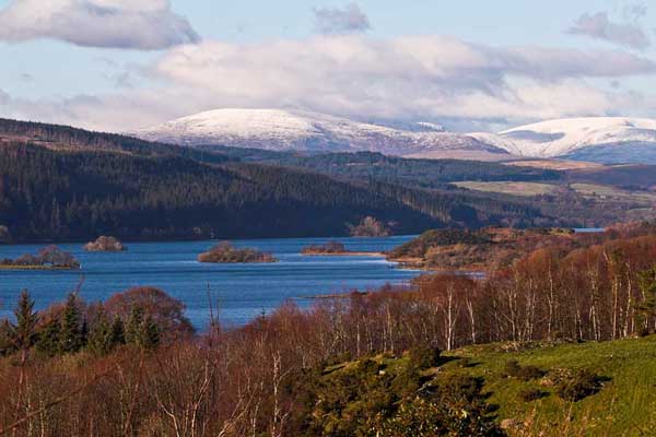 Loch Ken just north of Castle Douglas has been called one of the prettiest lochs in Scotland. Along its 9 mile ribbon length the landscape changes constantly: marshes, birchwoods, hills, forests, villages, pasture, the old "Paddy Line" rail bridge, etc.